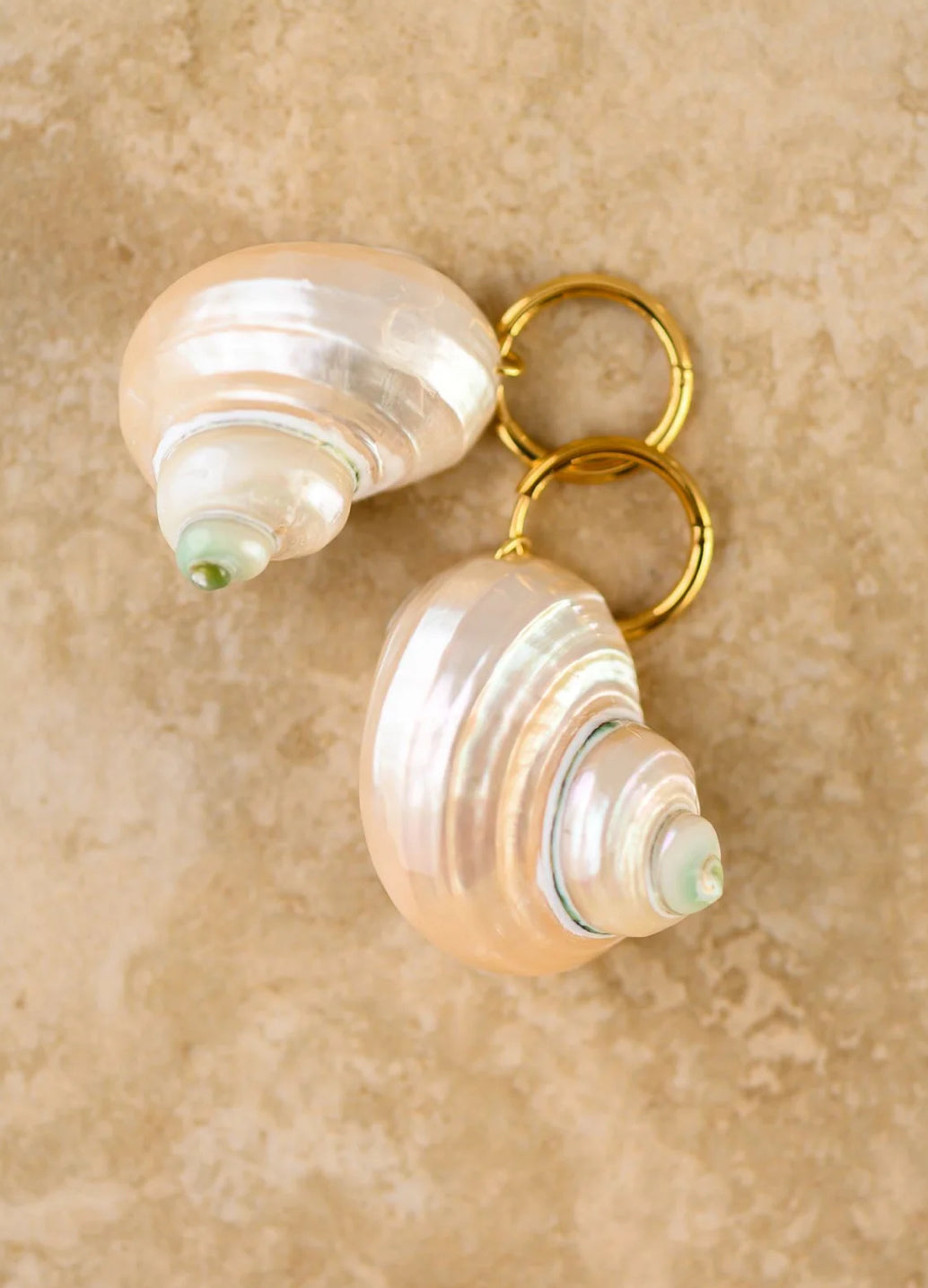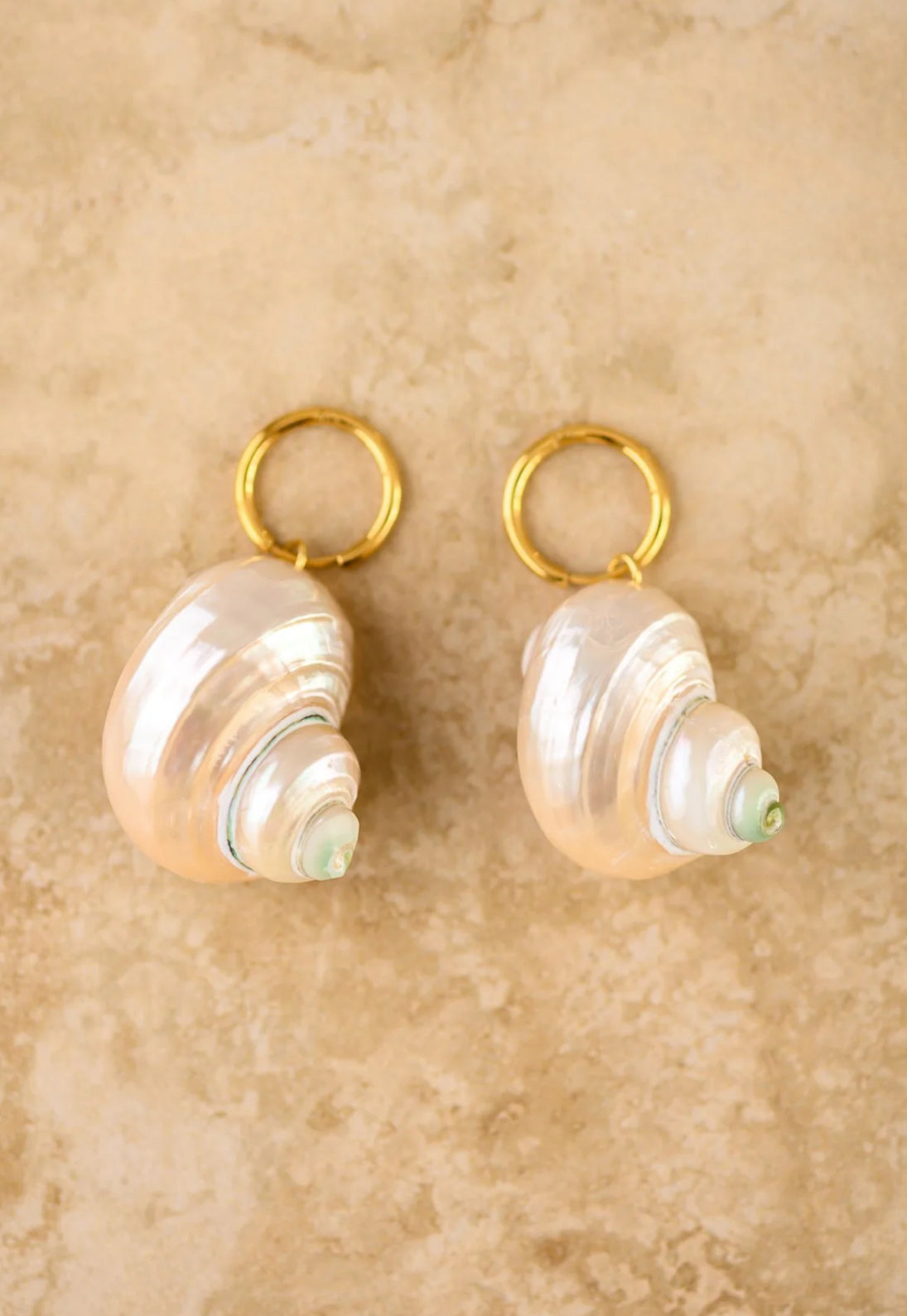 Oceanic elegance in every detail. The NAHLA Earrings feature natural conch shells suspended from timeless 18kt gold plated hoops — a beautiful blend of earthy texture and golden glow, perfect for effortless summer styling.