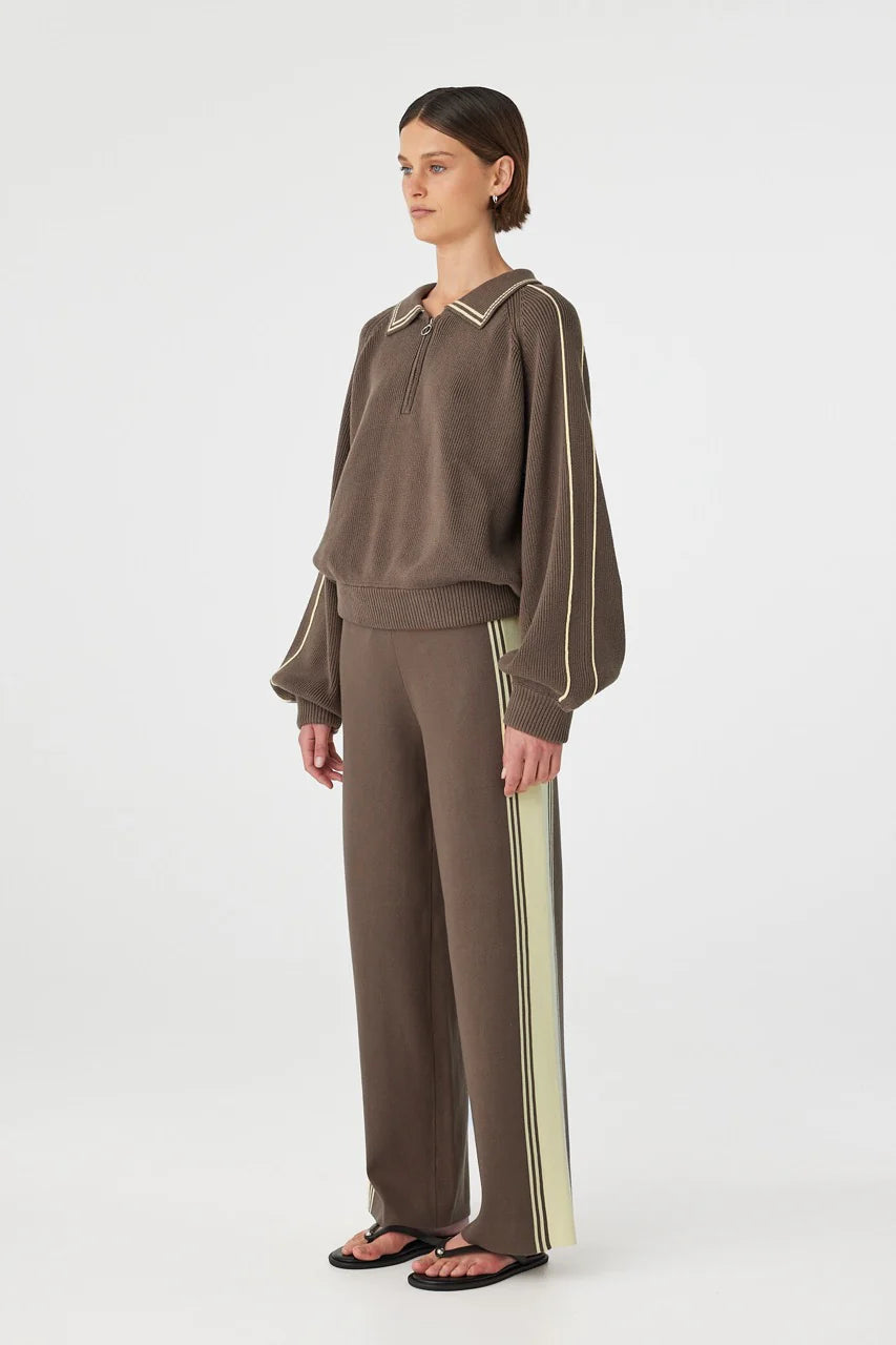 A structured knit with a sporty edge, designed with a quarter length metal zip and contrast piping along the sleeves and collar. Made from 100% cotton, it holds its shape while remaining comfortable to wear. Raglan sleeves and an elasticated ribbed waistband and cuffs create a clean, slightly cinched finish.