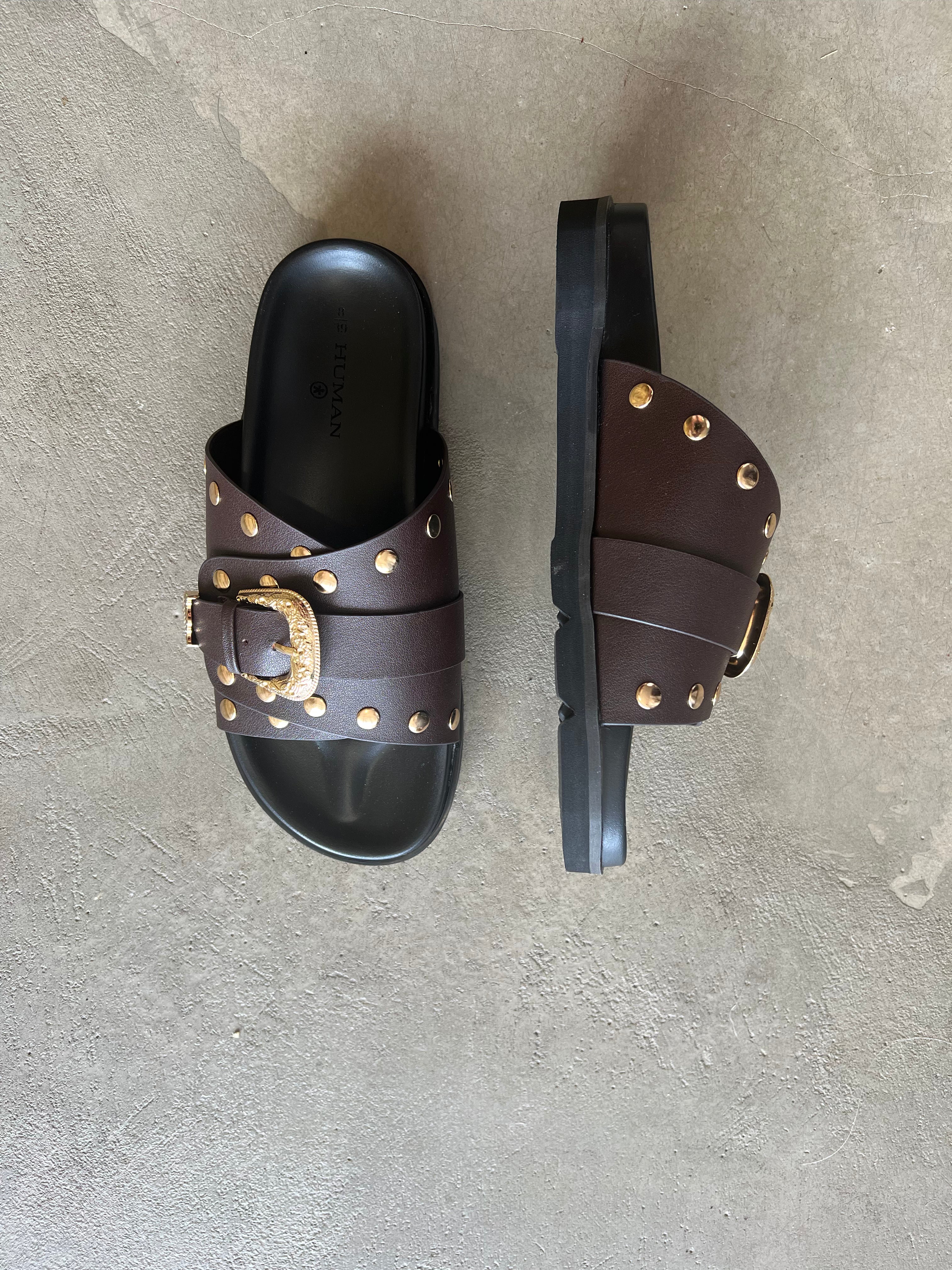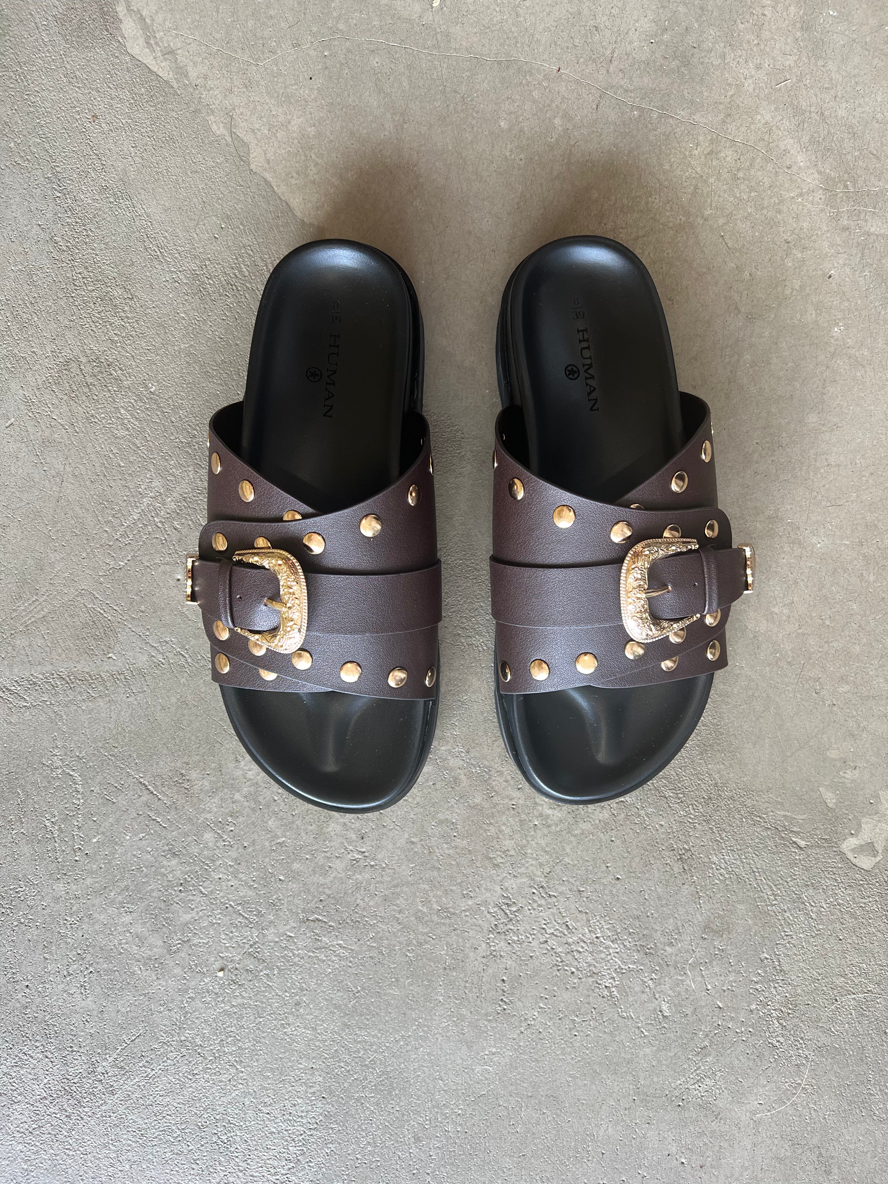 Bringing some Western into a classic slide, the Aria in chocolate is the perfect addition to your shoe collection.