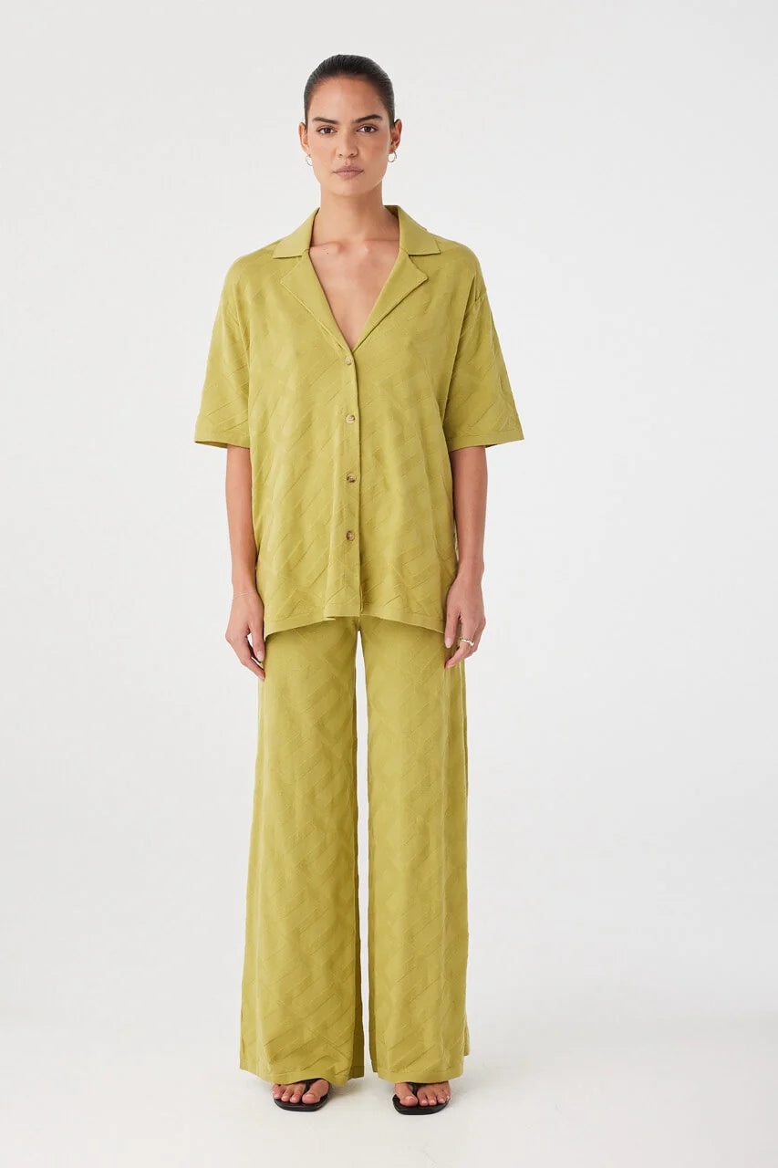 The Aria Shirt in Matcha brings freshness to a classic oversized silhouette. Crafted from 100% organic cotton, the lightweight patterned knit allows natural airflow, while the button-down front, open collar, and side splits give versatility in styling. A breathable layer for warmer climates and seasonal transitions.