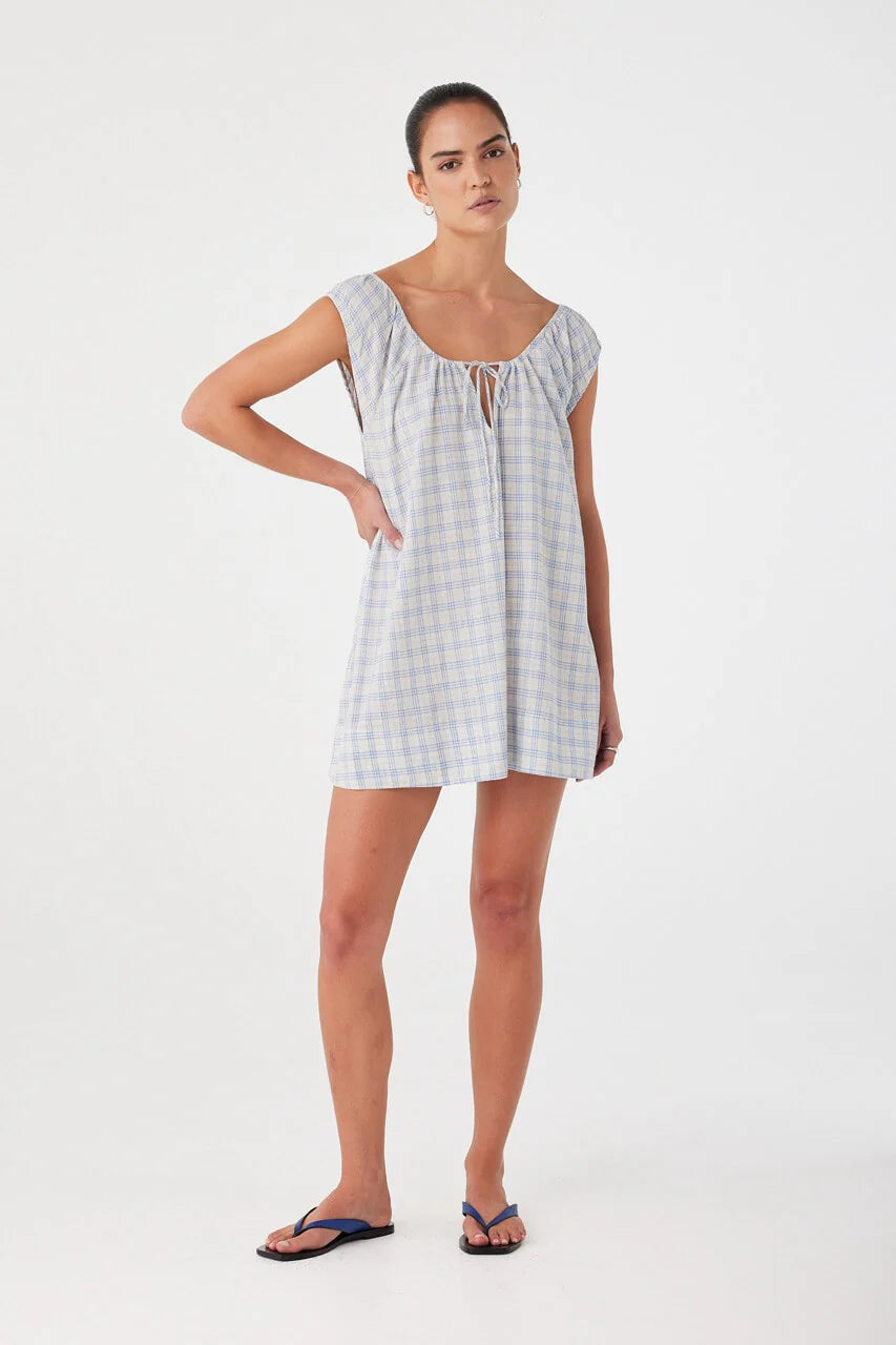 A lightweight flared mini dress in a soft cotton check, following the silhouette of our most-loved Chloe Dress.