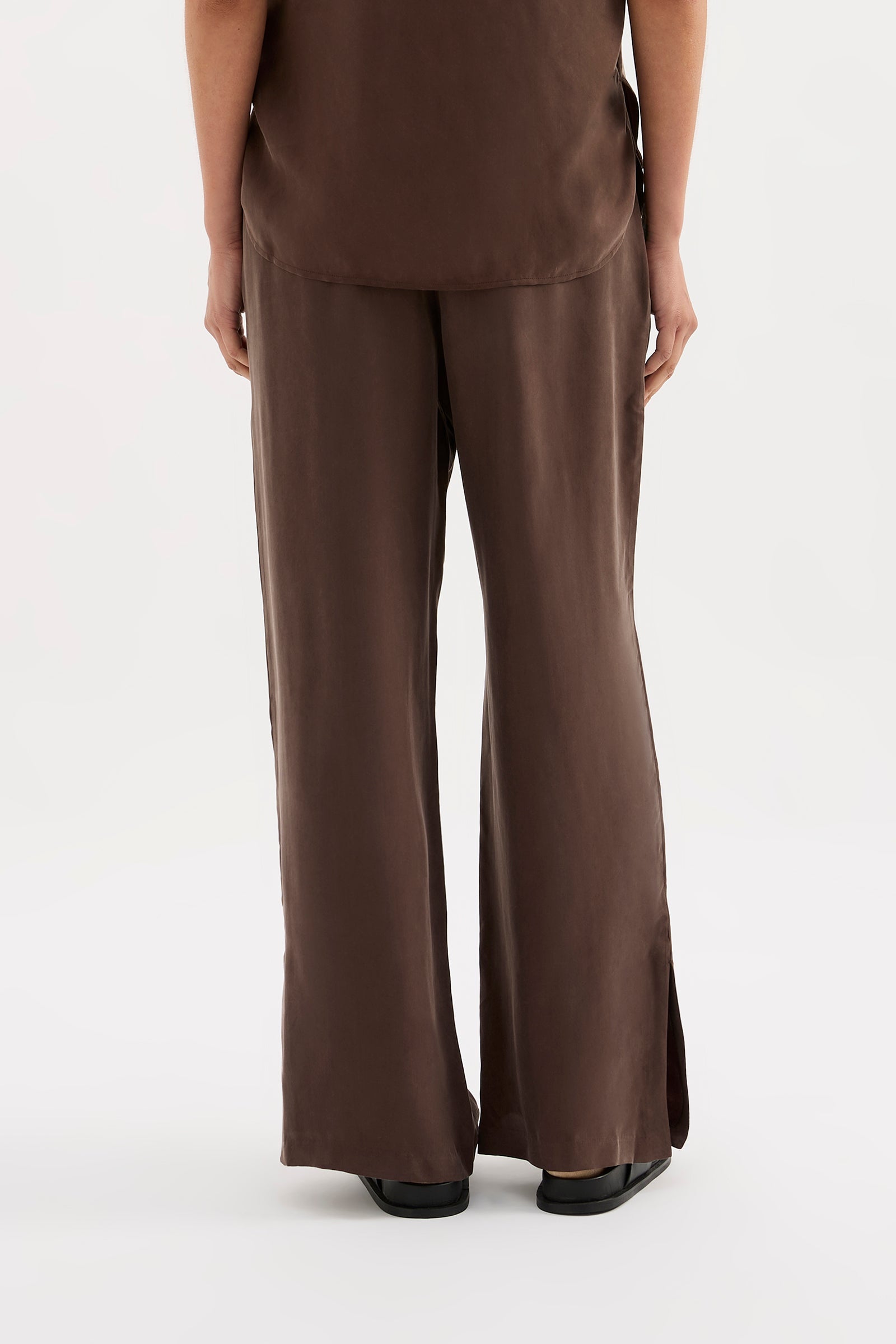 The Dara Cupro Pant in pickle is made in our signature cupro fabrication which has a soft, sueded hand feel. The silhouette is a relaxed wide leg, full length pant. Features include an elasticated waistband, side seam pockets and slits at hem.