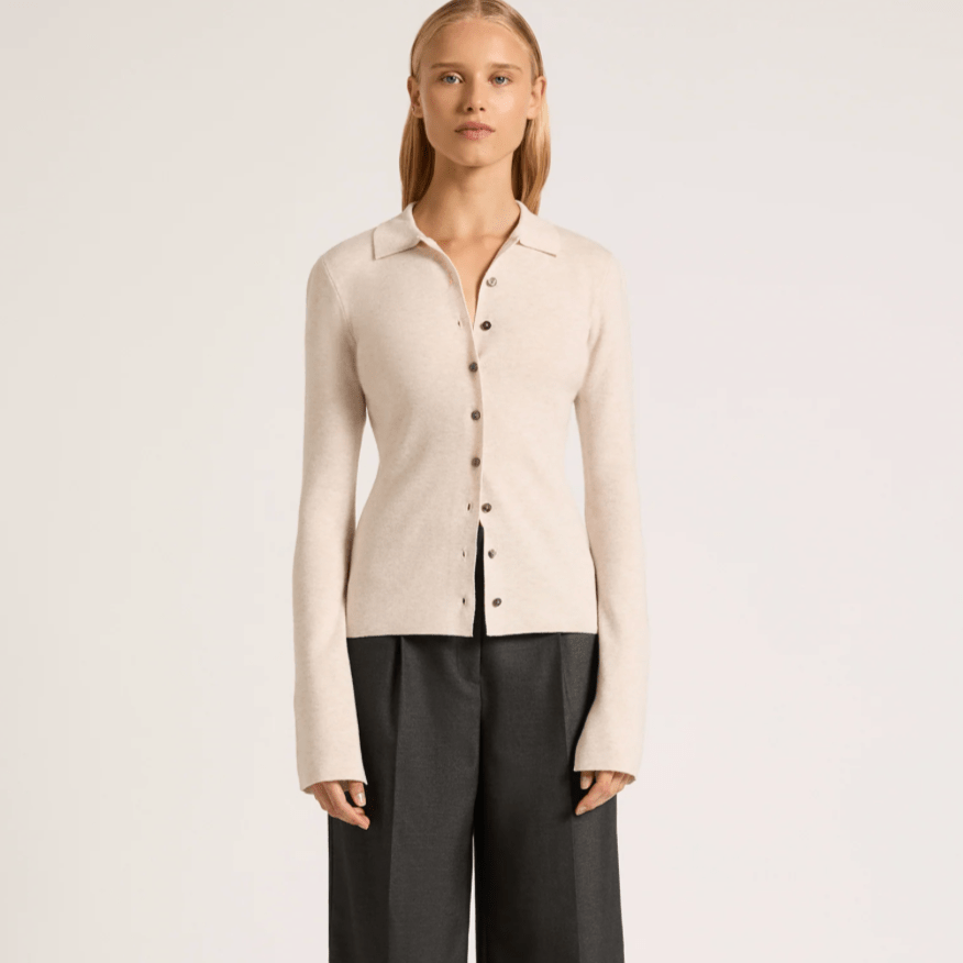 The Coda Knit is made from a merino wool blend yarn with soft hand feel. The silhouette is fitted to the body with length finishing on the hip. Features include full length sleeves with a slit on the cuff and shell buttons.