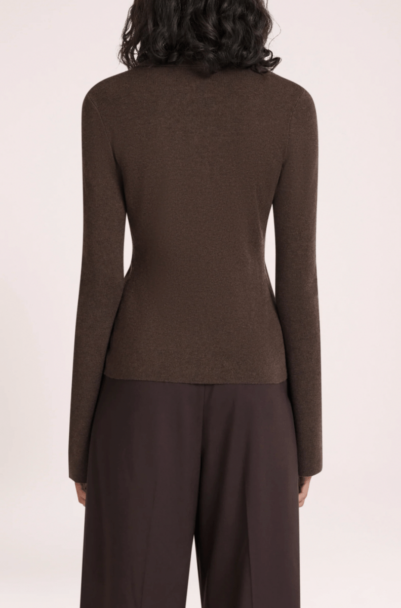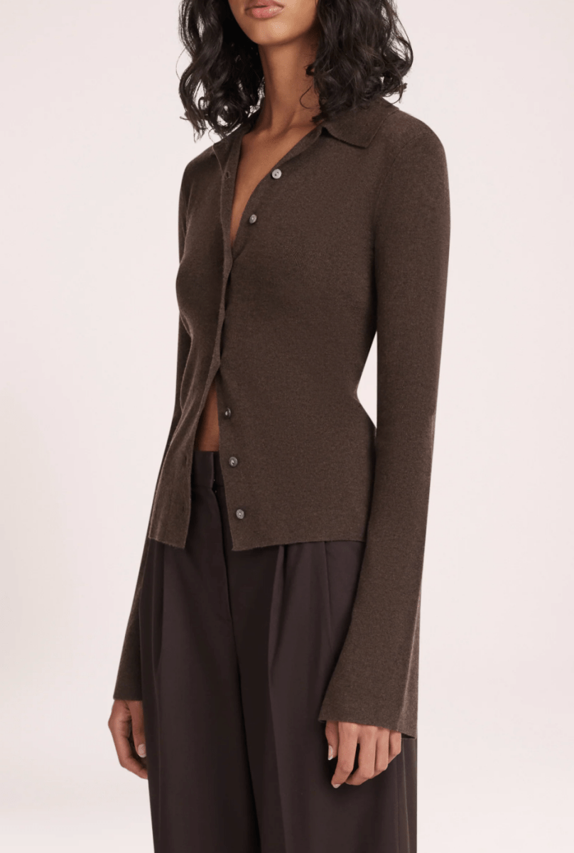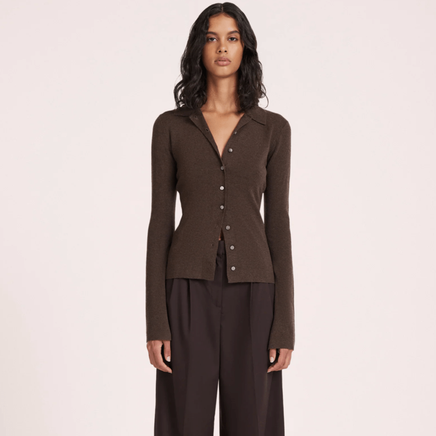 The Coda Knit is made from a merino wool blend yarn with soft hand feel. The silhouette is fitted to the body with length finishing on the hip. Features include full length sleeves with a slit on the cuff and shell buttons.