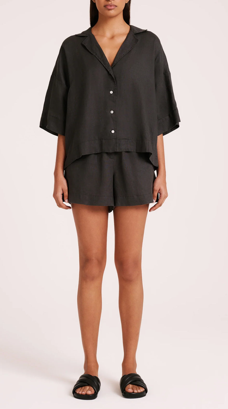 Crafted in 100% premium lightweight linen and washed down for a soft and breathable handfeel. The Nude Linen Lounge Shirt is a classic shape with a clean and casual fit. Features include a wide collared neckline, button front opening and wide elbow length sleeves. This shirt also includes the Nude Lucy branded label.