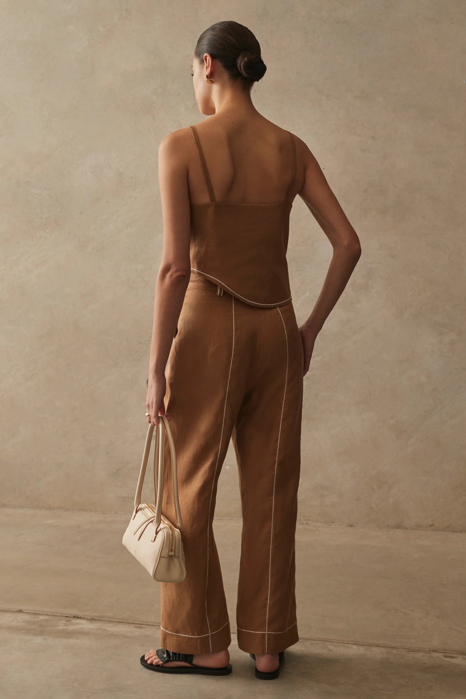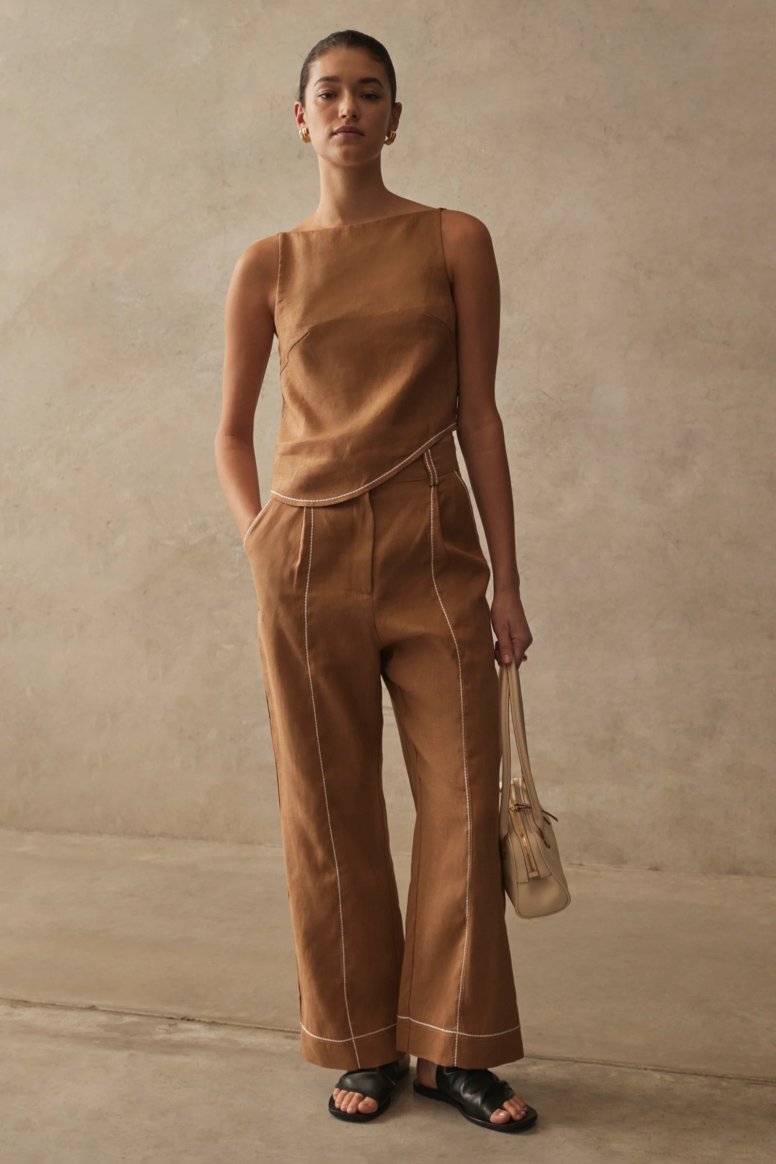 Crafted with a statement, contrast embroidery stitch, the Coralie Top is a beautiful, dressed-up tank style. This super flattering top is made from luxurious linen fibres, made breathable and easy to wear in warm weather. The stitching highlights the unique asymmetric hemline and pair perfectly with our Avalon Pants.