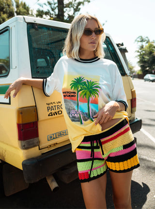 Woman in a light green tank top and beige pants holding a drink, standing next to a graffiti-covered wall.