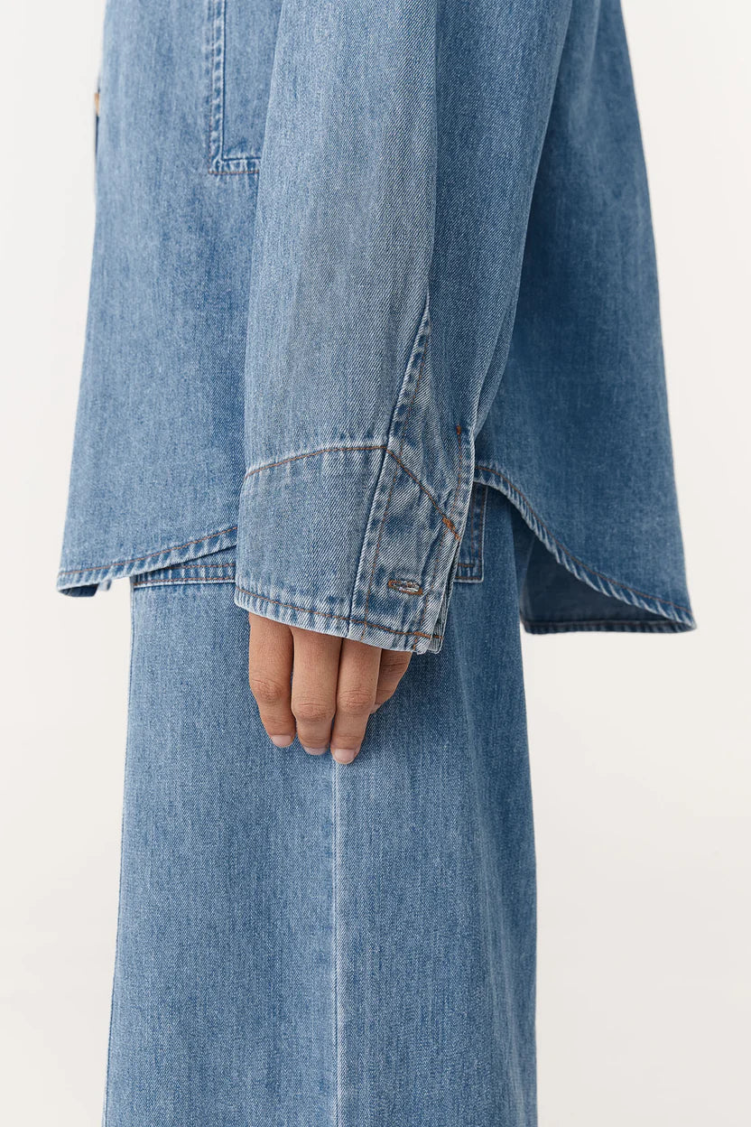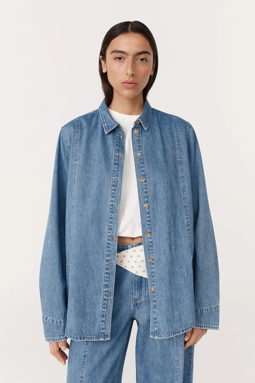 The Dante Shirt is cut in a relaxed, boyfriend silhouette with front panel detailing and contrast topstitching. Crafted from signature ROWIE denim and finished with faux tortoiseshell buttons, it’s a modern nod to utility - designed to wear in, not out.