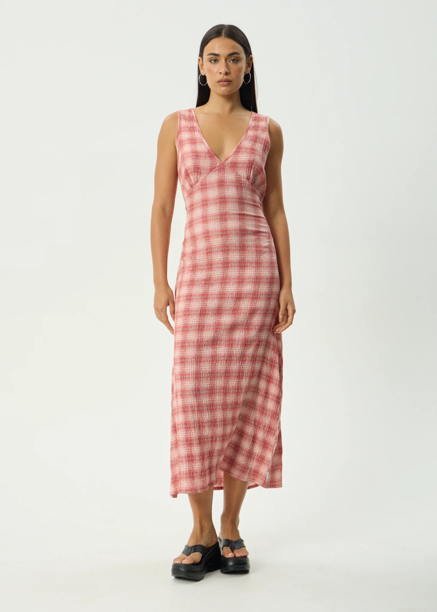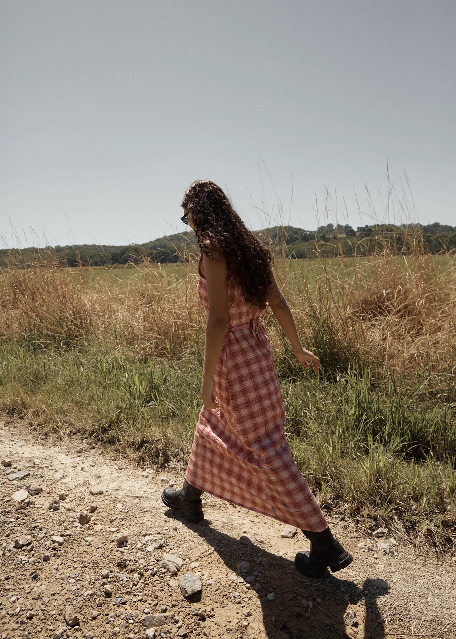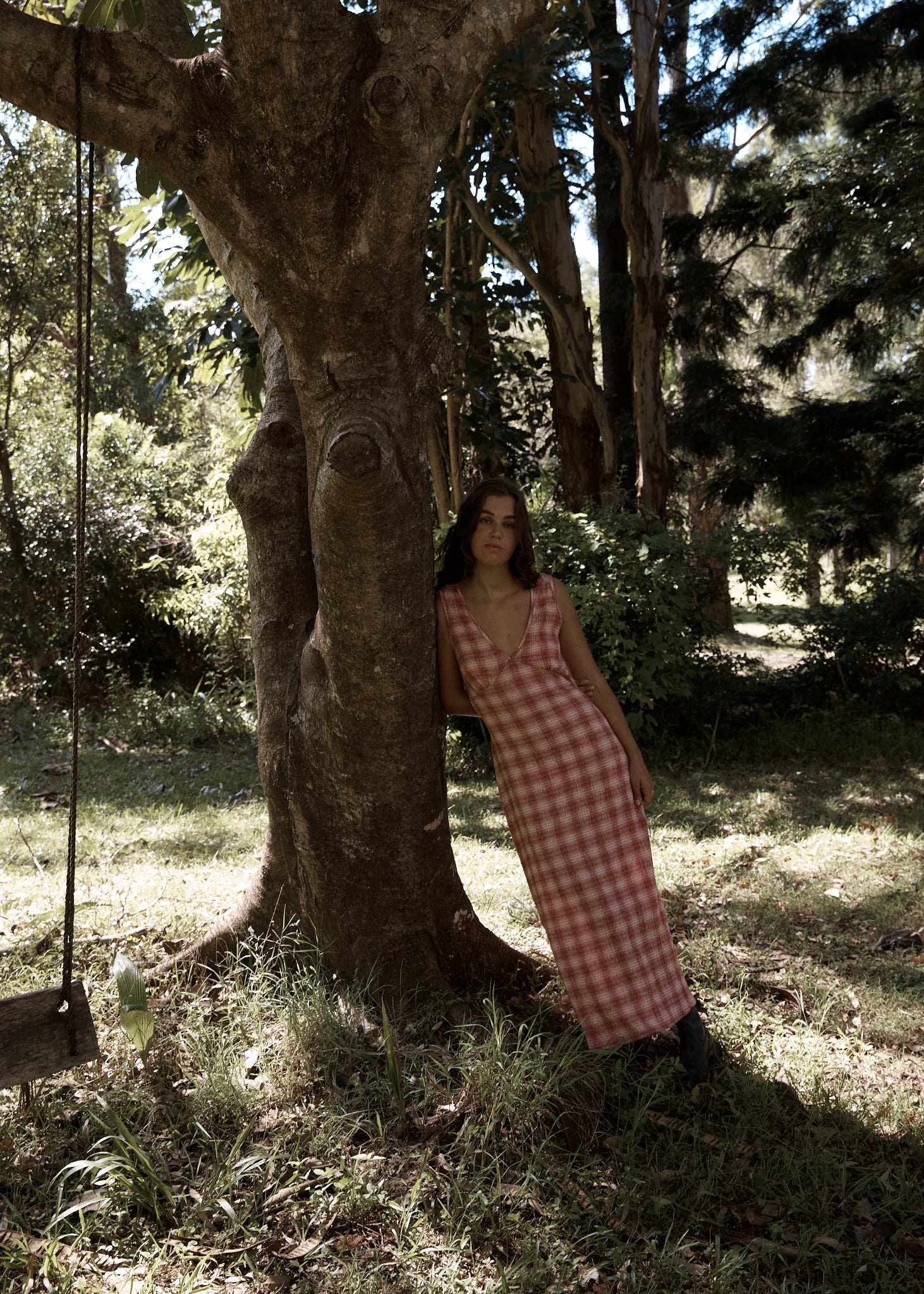 The 'Position' maxi dress offers a longline, semi-fitted silhouette in an updated red check, with a removable waist tie and gathered bust for a flattering shape. Made from a lightweight, textured seersucker blend of hemp and tencel, this dress combines comfort and style with its v-neck and back, and in-house designed, yarn-dyed woven check.