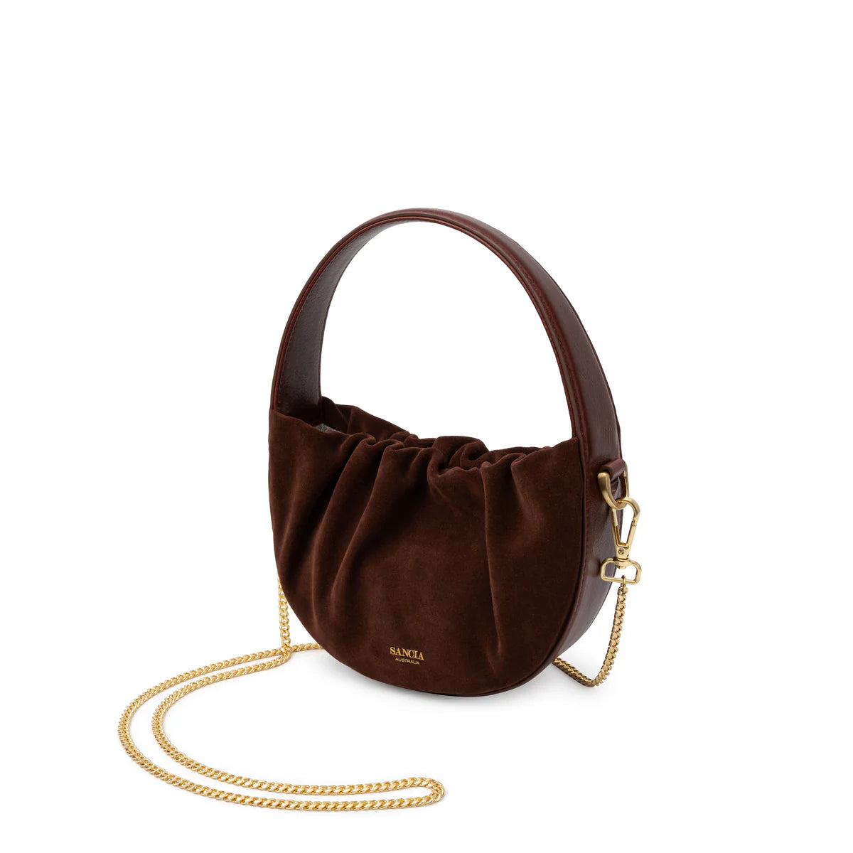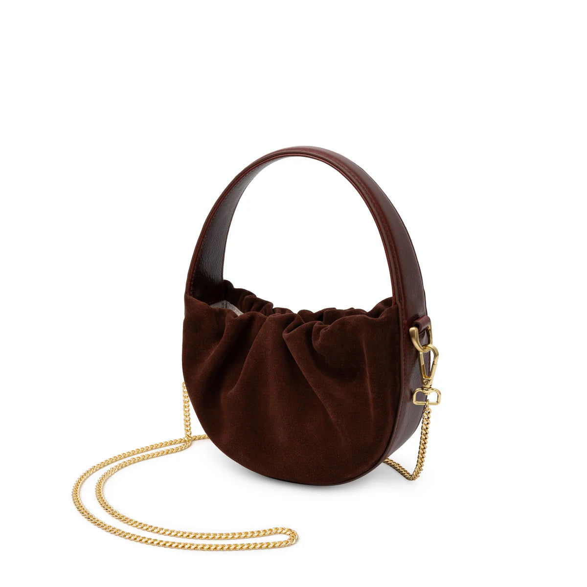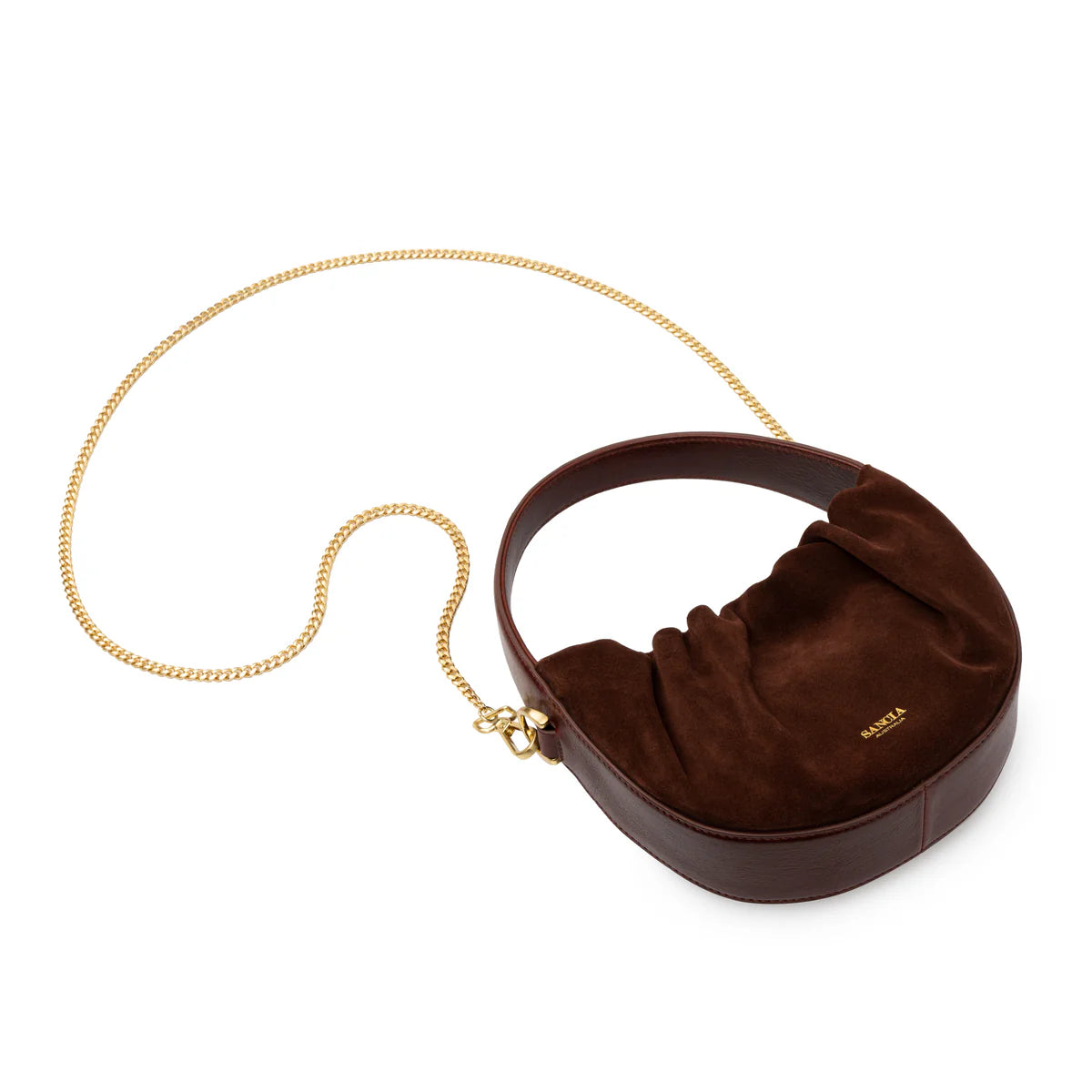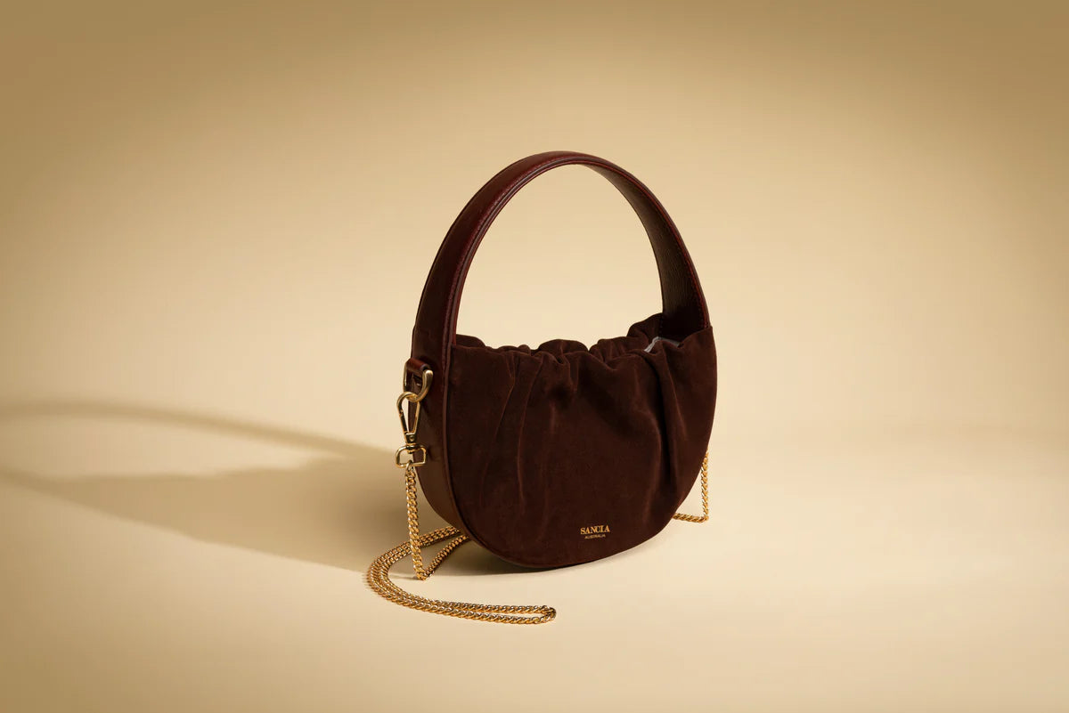 The perfect occasion bag, the Velenje is SANCIA’s take on the slouchy crescent bag. Made in a half-moon shape in sumptous leather / suede, the opening of the bag sits open with ruching to create movement and volume. The bag features an invisible magnet closure, a structured wide handle, and a long gold chain shoulder option.